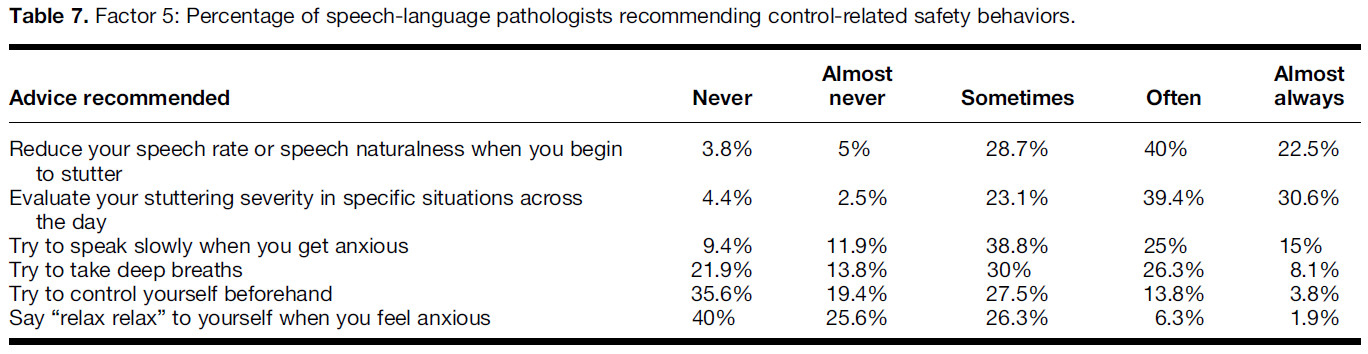 需決定成人接受口吃治療而遵循臨床建議的頻率(此指"安全行為"策略的使用頻率).此外,需經實證確認長期追蹤這些建議是否會抵制恐懼消退(fear